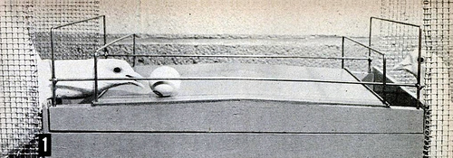 Wonderful picture from 1950 relating to B.F Skinner's research into the theory that reward is more effective in getting people - or in this case pigeons - to perform tasks. The text accompanying the photo was as follows: In still another of Professor Skinner's exhibits, which demonstrates competition, the birds play a modified game of ping-pong. Considerably smaller than regulation size, being about two feet square, and has no net. One pigeon, using his beak, tries to bat the ball past his opponent. Rallies sometimes go to three or four shots but most of the shots are "aces." The winner is rewarded with food after each shot. Psychology on Kindle